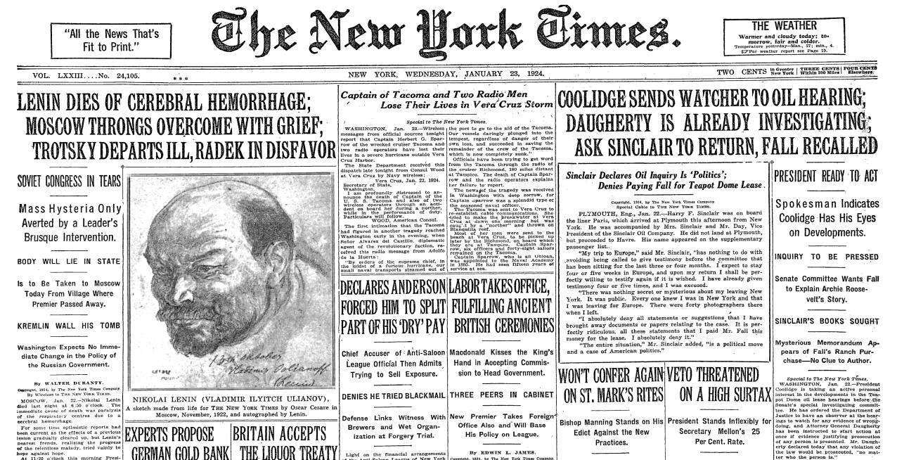 آقای لنین به گشنیز گفت: «مبارزه ما علیه تزار به بنبست خورده بود و سوسیالدموکراتهای مالهکش عملا چوب لای چرخ قطار انقلاب میگذاشتند. ما مایوس و درمانده شده بودیم و نمیدانستیم چه غلطی بکنیم تا آنکه برادر خوب و مهربانم لئون ایده درخشانی را مطرح کرد و گفت باید دشمن امپریالیستی را در قلب آن و از طریق ضعیفترین حلقه زنجیری که چیزی جز آن برای از دست دادن نداریم هدف قرار بدهیم. بنابراین رفقای ما حملات پیاپی خود علیه خبرنگار نیویورک تایمز را آغاز کردند. روی دیوارهای کرملین والتر دورانتی مطلب مینوشتیم و در شهر شبنامههایی علیه او پخش میکردیم که افشا میکرد چه طور این قلم به دست مزدور واقعیتهای ظلم و جور حکومت طاغوتی تزار را تلطیف یا عادیسازی میکند. علاوه بر این با پست و تلگراف به دفتر این جریده فخیمه در بلاد فرنگ هم پیغام دادیم که خبرنگارتان را جمع کنید. سرانجام مبارزات ما جواب داد و نیویورک تایمز ناچار شد در صفحه اولش یک بار تیتر بزند تزار خیلی بد است و لنین خیلی خوب است. همین شد که انقلاب اکتبر پیروز شد.»